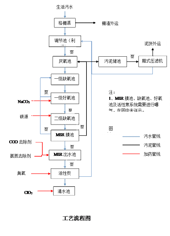 生活污水先经过机械格栅去除大的固体污染物,防止堵塞水泵;然后自流进入调节池,对进水水量水质进行调节,降低进水对管渠和水处理构筑物正常工作的不利影响;再通过提升泵提升至初沉池,去除污水中的可沉物和漂浮物,减轻后续处理设施的负荷;然后自流进接触氧化池,在此绝大部分有机污染物通过生物氧化、吸附得以降解(主要去除COD、BOD、NH3);然后进入MBR膜池,一部分通过抽吸泵,从MBR膜中过滤出合格达标水;从膜池出来的泥水混合物自流进入二沉池,活性污泥通过污泥回流泵回流至接触氧化池,上清液流入中间水池,剩余污泥通过排泥阀,排到污泥池;中间水池中的水通过中间水泵提升至过滤器,经过进一步过滤,排放到清水池回用。污泥经污泥泵抽至污罐车运至矿井水处理站压滤脱水后用于绿化及农田施肥。